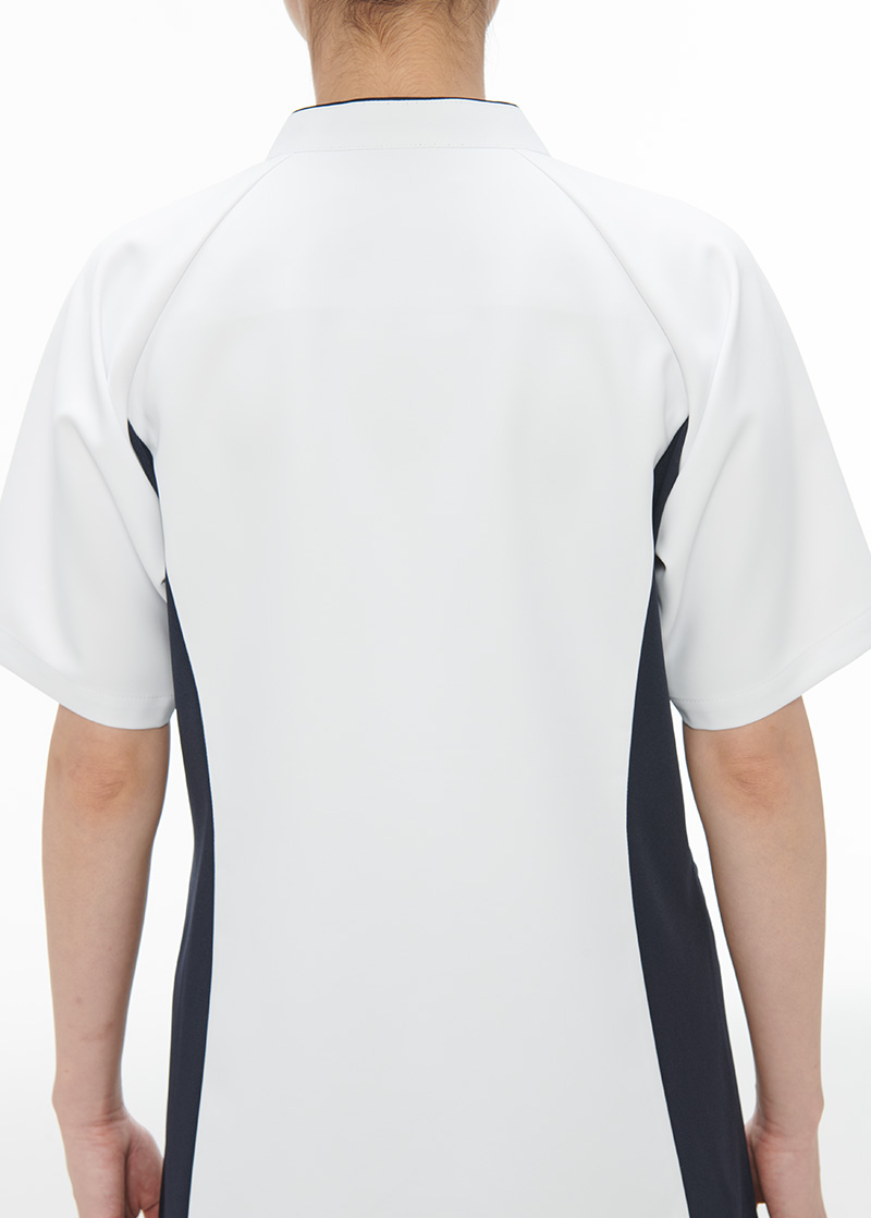 センターファスナー開き・ラグランスリーブの男女兼用スクラブです。胸ポケットを二枚ずらして重ねたデザインがスタイリッシュ。バックスタイルの両サイドに配したニット素材が動きやすさと涼しさを提供します。適度なゆとりのあるシルエットになっています。●男女兼用●前両腰ポケット●スマートフォン用ポケット右側●マルチループ胸元●キーループ右脇
