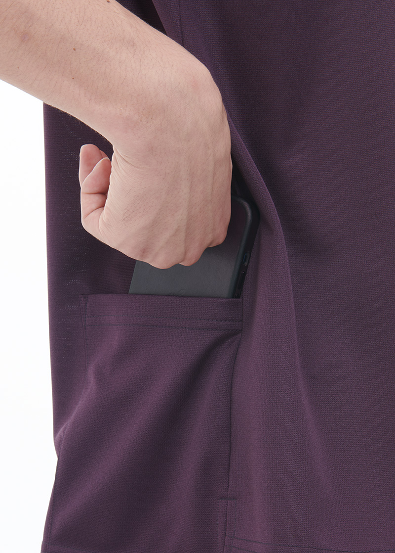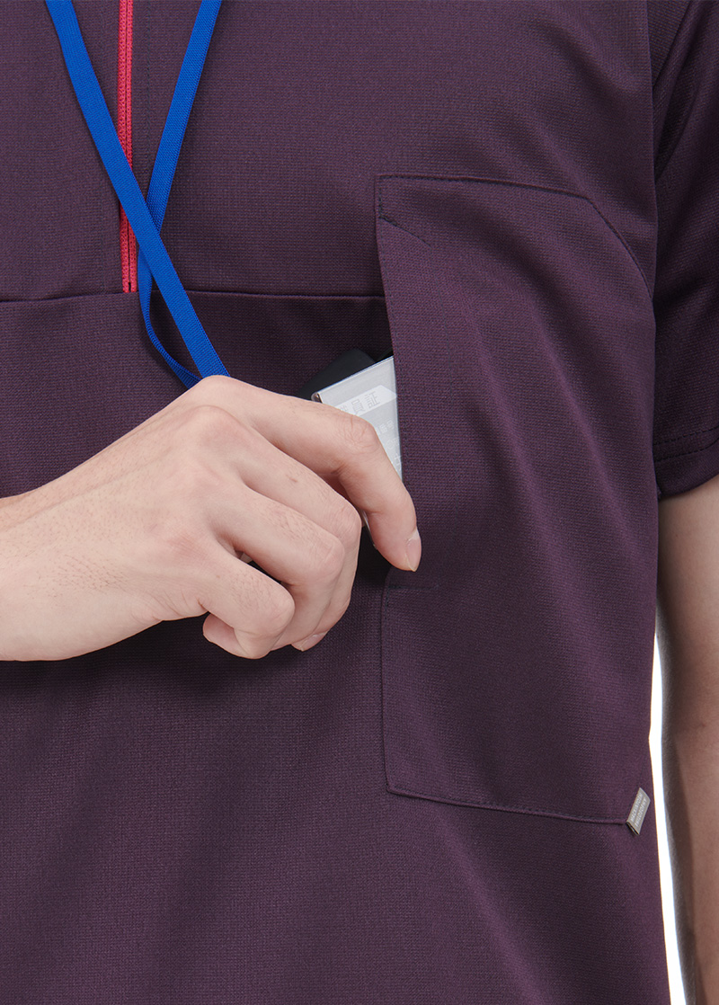 左胸ポケット口は並行ではなく垂直に配置している為、首から下げた名札などをサッと収納でき、かがんでも落ちにくい構造になっています。
